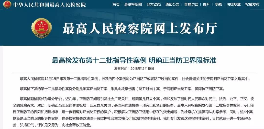 2018年12月19日,最高人民检察院印发第十二批指导性案例,涉及的四个案例均为正当防卫或者防卫过当的案件,社会普遍关注的于海明正当防卫案入选其中。