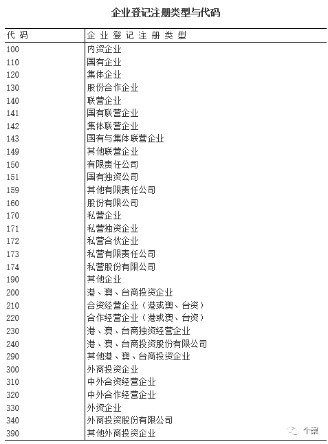 另外,通常全国企业信用信息系统或对方营业执照的“类型”一栏中也会标注企业的具体类型。在一些情况下,若企业类型一栏对应的为代码的,下图便是不同的代码所对应的企业类型:
