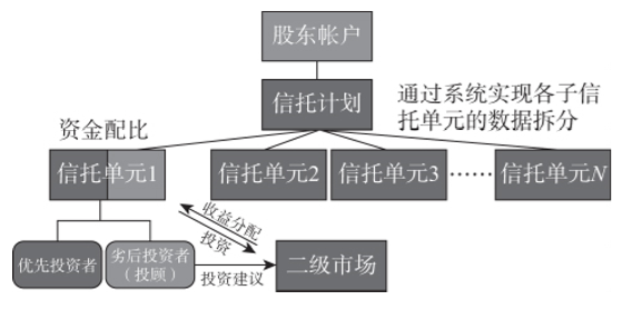 1. 伞形信托系采用母子信托结构的结构化信托,同一个信托产品之间包含两种或两种以上不同类别的子信托,每个子信托单元类似于单一结构化信托,是结构化证券投资信托的创新品种。实际操作中,往往由证券公司、信托公司与银行等金融机构结合自身优势,为证券二级市场的投资者提供投、融资服务的结构化证券投资产品。具体来说,就是银行理财资资金借道信托产品,通过配资、融资等方式,增加杠杆后投资于股市,银行发行理财产品认购信托计划优先级受益权,其他潜在客户认购劣后受益权,由劣后级投资者获取剩余收益。伞形信托最初用于解决信托证券账户匮乏的问题,现多用于多名资金量有限的投资者(劣后受益人)提供结构化证券投资的融资服务。